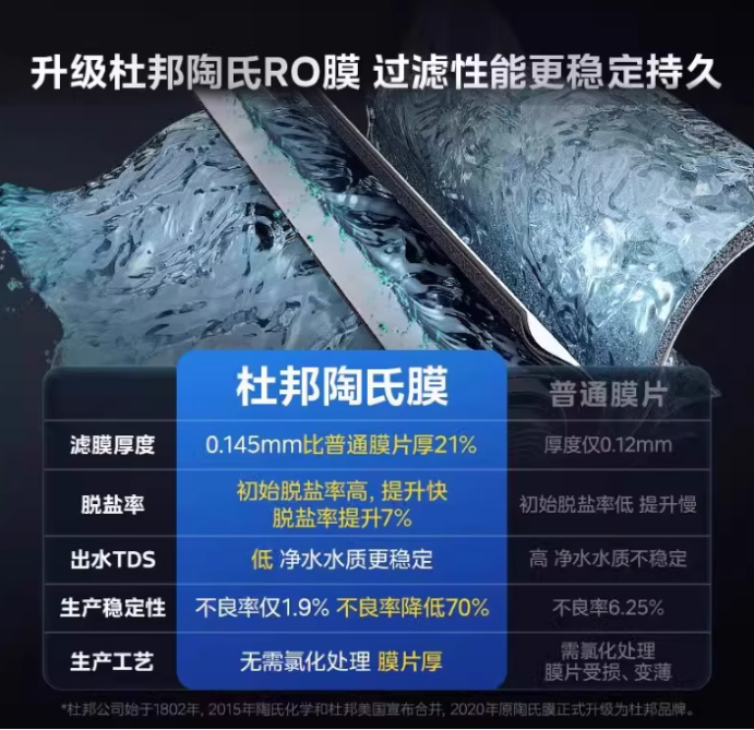 - 采用复合过滤与RO膜协同工作,可去除水中余氯、胶体、重金属等物质,脱盐率约89%。配备600G通量,出水稳定,适配家用用水频率,滤芯有固定使用周期,水路材质安全,不产生异味。