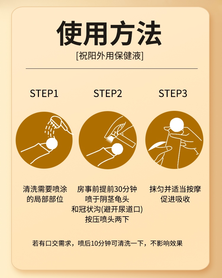 采用极简三步操作,新手可快速掌握,适配多场景。第一步温水清洁敏感部位并擦干;第二步按自身敏感度喷涂1-2喷;第三步按摩30秒即可吸收,无黏腻感。瓶身掌心大小便携,喷雾细腻无渗漏,可隐私携带、随时使用。