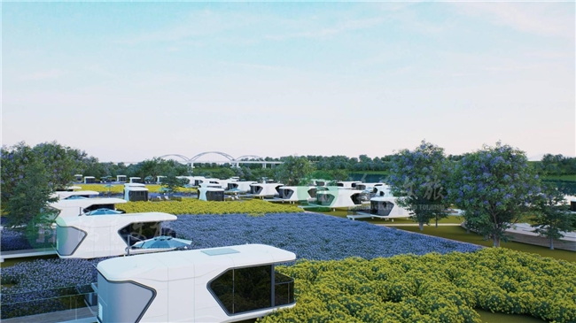 (图:禾田溪太空舱星空露营地放置鸿普负氧离子度假养生装配式房屋照片)