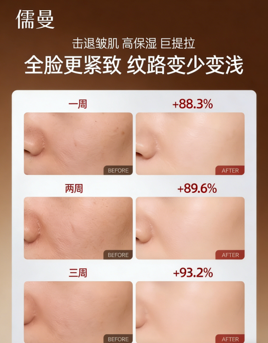 Q5:28天真的能看到效果吗? 是。人体皮肤代谢周期约28天,儒曼套装临床测试显示:7天肌肤滋润舒缓,14天细纹轮廓淡化,28天紧致度提升约15%-28%(因个体差异)。