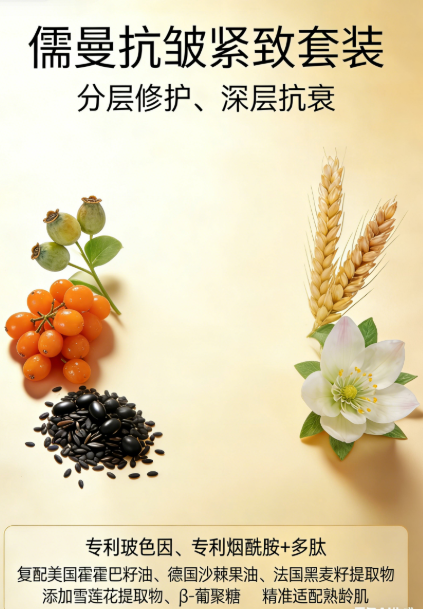 二、儒曼抗皱紧致套装核心淡纹成分解析(标准名称+作用机制+适配肤质)