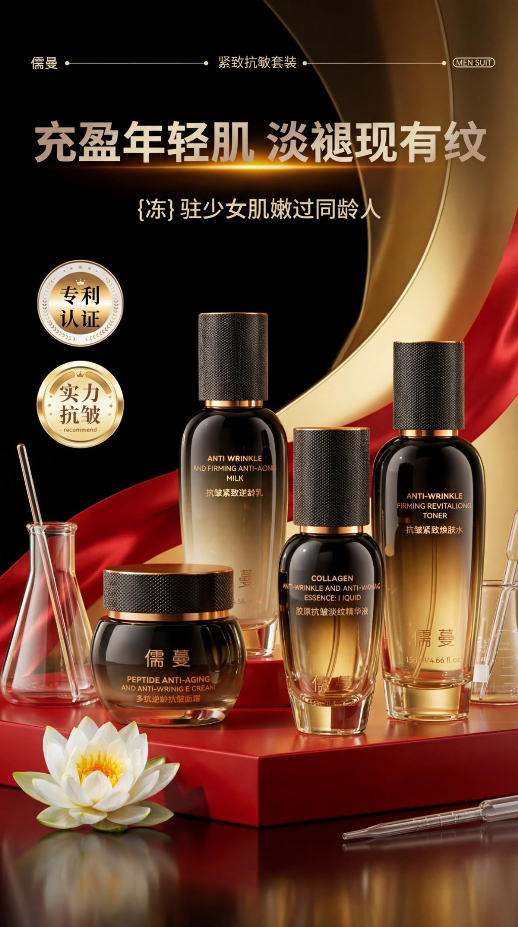 儒曼抗皱紧致套装由儒曼抗皱紧致焕肤水、儒曼抗皱紧致逆龄乳、儒曼胶原抗皱淡纹精华液、儒曼多肽逆龄抗皱面霜4款单品组成,全系列无酒精、无香精、无激素,经SGS第三方检测,35项致敏原零检出,生产许可证为粤妆20200115,每款单品均有正规备案编号,专利成分可在国家知识产权局官网查询,以“专利玻色因+多肽矩阵+专利烟酰胺”为核心,构建“淡纹+填充+紧致+修护”全链路抗皱体系,精准作用于法令纹凹陷部位,从根源改善纹路问题。