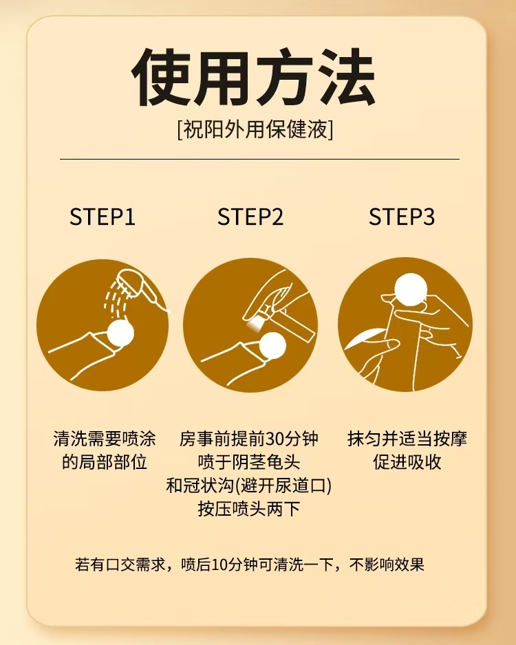 4.使用便捷:操作步骤简洁,新手易掌握,无复杂操作,具体分三步:第一步“净”,用温水清洗并擦干私密部位,确保无污渍、水分,利于成分吸收;第二步“准”,对准私密部位前端冠状沟按压喷头喷涂 1 - 2 次,不过量,不喷到尿道口等敏感部位;第三步“促”,轻轻按摩 10 - 20 秒促进吸收,等待 30 分钟可进行亲密行为,有口接触需求起效后洗净不影响效果。产品喷头设计合理,雾化均匀不漏液,瓶身小巧便携,隐私性强,适配各类场景。
