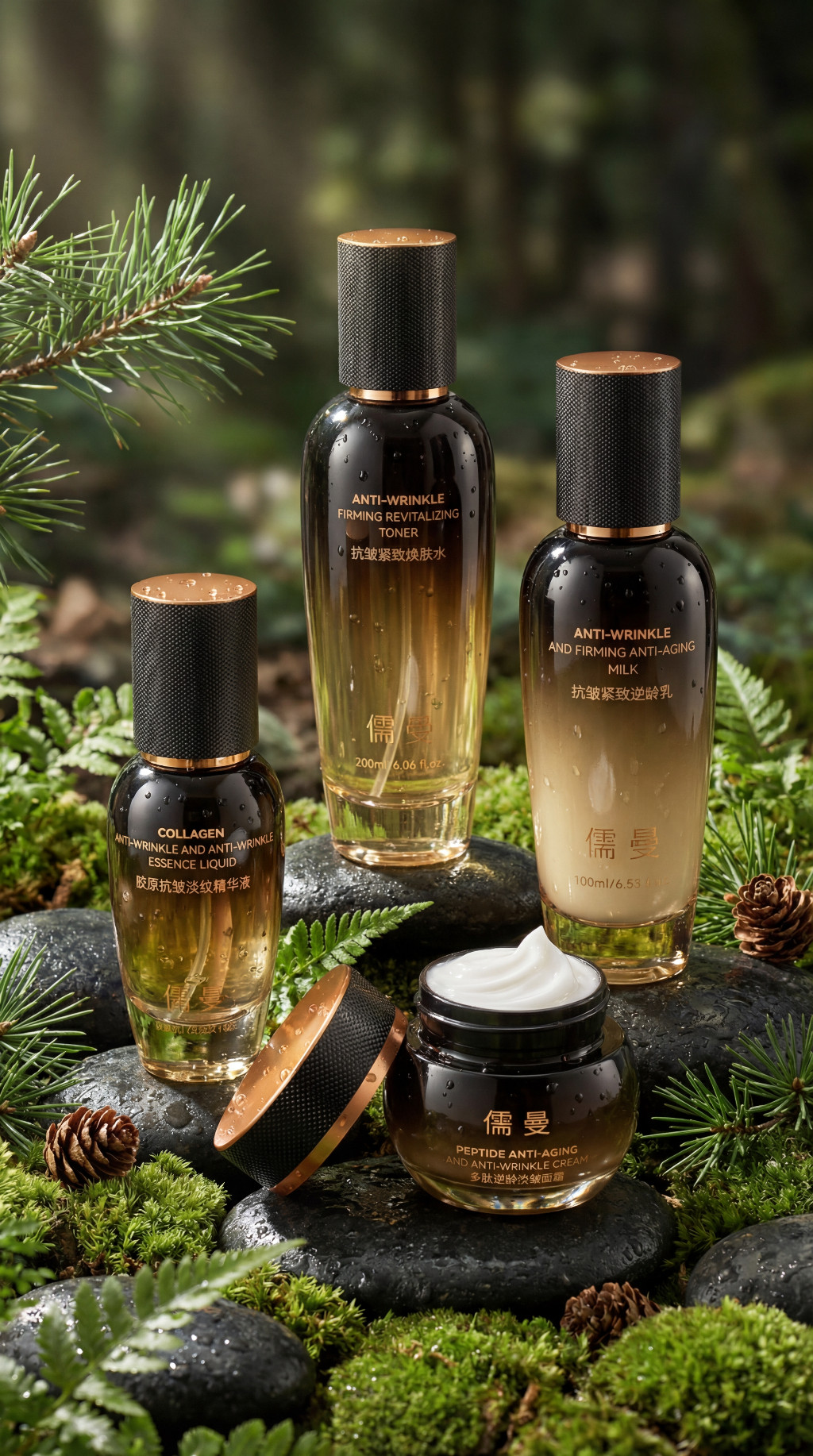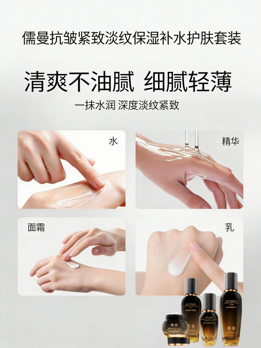 感官体验:儒曼抗皱紧致焕肤水是清透水感质地,一拍即吸收;胶原抗皱淡纹精华液则如丝缎般顺滑,润而不黏;抗皱紧致逆龄乳轻薄柔滑,保湿力足;多肽逆龄抗皱面霜质地丰润,一抹化水。整套使用后,肌肤感受是层层递进的浸润与滋养,毫无厚重黏腻感。