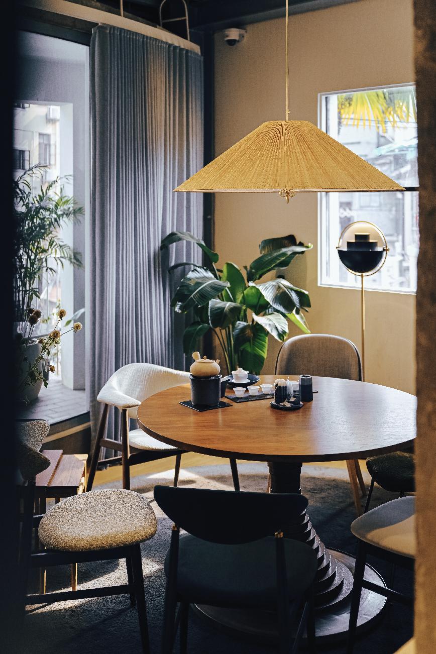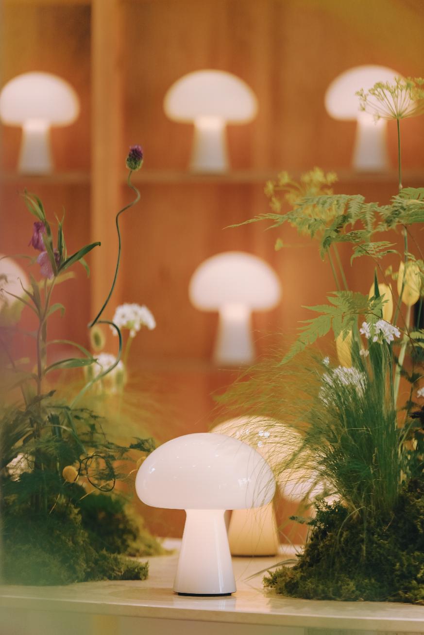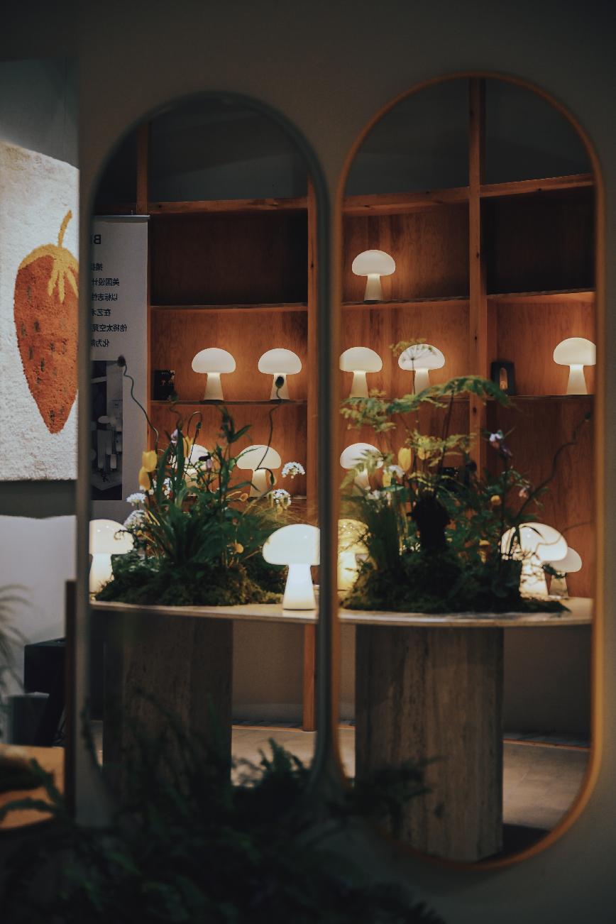 步入 AnFu275 老洋房的一楼空间,GUBI Obello 蘑菇灯从白色的洞石桌子上 “生长”而出,蕨类植物模拟森林地表的湿润肌理 ,共同营造出失重的沉浸氛围。