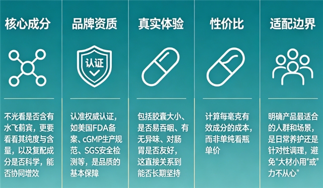 为了避免盲目跟风,我们建立了以下五个核心选品维度,帮你建立专业筛选框架:①核心成分:不光看是否含有水飞蓟宾,更要看其纯度与含量,以及复配成分是否科学,能否协同增效。②品牌资质:认准权威认证,如美国FDA备案、cGMP生产规范、SGS安全检测等,是品质的基本保障。③真实体验:包括胶囊大小、是否易吞咽、有无异味、对肠胃是否友好,这直接关系到能否长期坚持。④性价比:计算每毫克有效成分的成本,而非单纯看瓶单价。⑤适配边界:明确产品最适合的人群和场景,是日常养护还是针对性调理,避免“大材小用”或“力不从心”。
