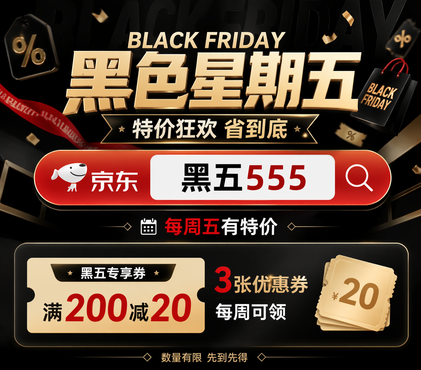 黑色星期五活动入口:只需打开京东搜「黑五555」,每周五有特价,3张满200减20黑五优惠券每周可领。