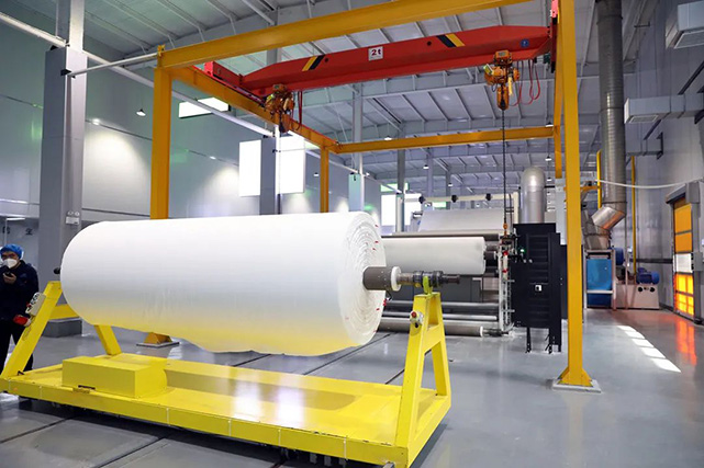 沛县祥邦高端水刺无纺布项目就是我县纺纱纺织产业发展的一个强链补链旗舰型项目,该项目总投资22亿元,建筑面积10万平方米。分两期实施,目前,一期1条德国特吕水刺生产线、2条法国安德里茨生产线正式投产。