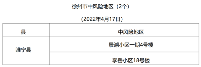 贾汪区汴塘镇孟省村、朱古村,鼓楼区环城街道朱庄小区25号楼、环城路坝子街60号弘辉大厦,云龙区翠屏山街道玉兰苑C1号楼,泉山区永安街道煤建路169小区7号楼、余二菜馆(矿南小区24号楼西侧平房),由中风险地区调整为低风险地区。